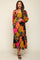 A floral maternity midi dress with a squared neckline, a smocked back, long puff sleeves, a ruffle accent under the bust, side pockets, and a gathered bottom tier.