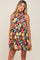 A floral maternity dress with a ruffled mock neck, a tiered body, and a back keyhole button closure. Dress is lined.