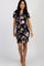 A floral print, fitted maternity dress with short sleeves and a rounded neckline.