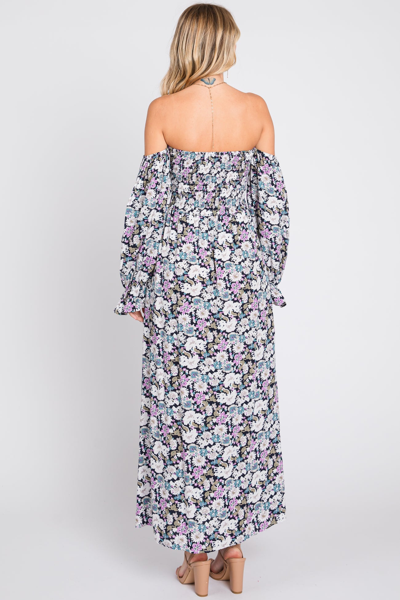 Black Floral Print Off Shoulder Smocked Maxi Dress