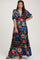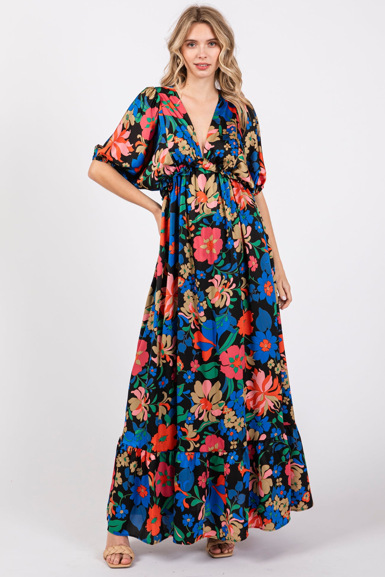 Black Floral Satin Deep V-Neck Puff Sleeve Maternity Maxi Dress