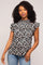 A floral print short sleeve blouse with a smocked neck and flutter cap sleeves.