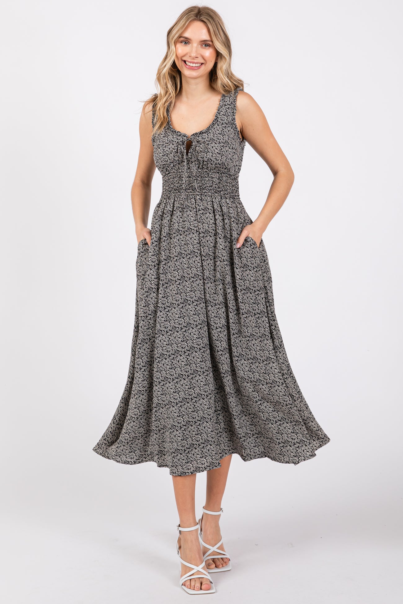 Black Floral Sleeveless Smocked Waist Midi Dress