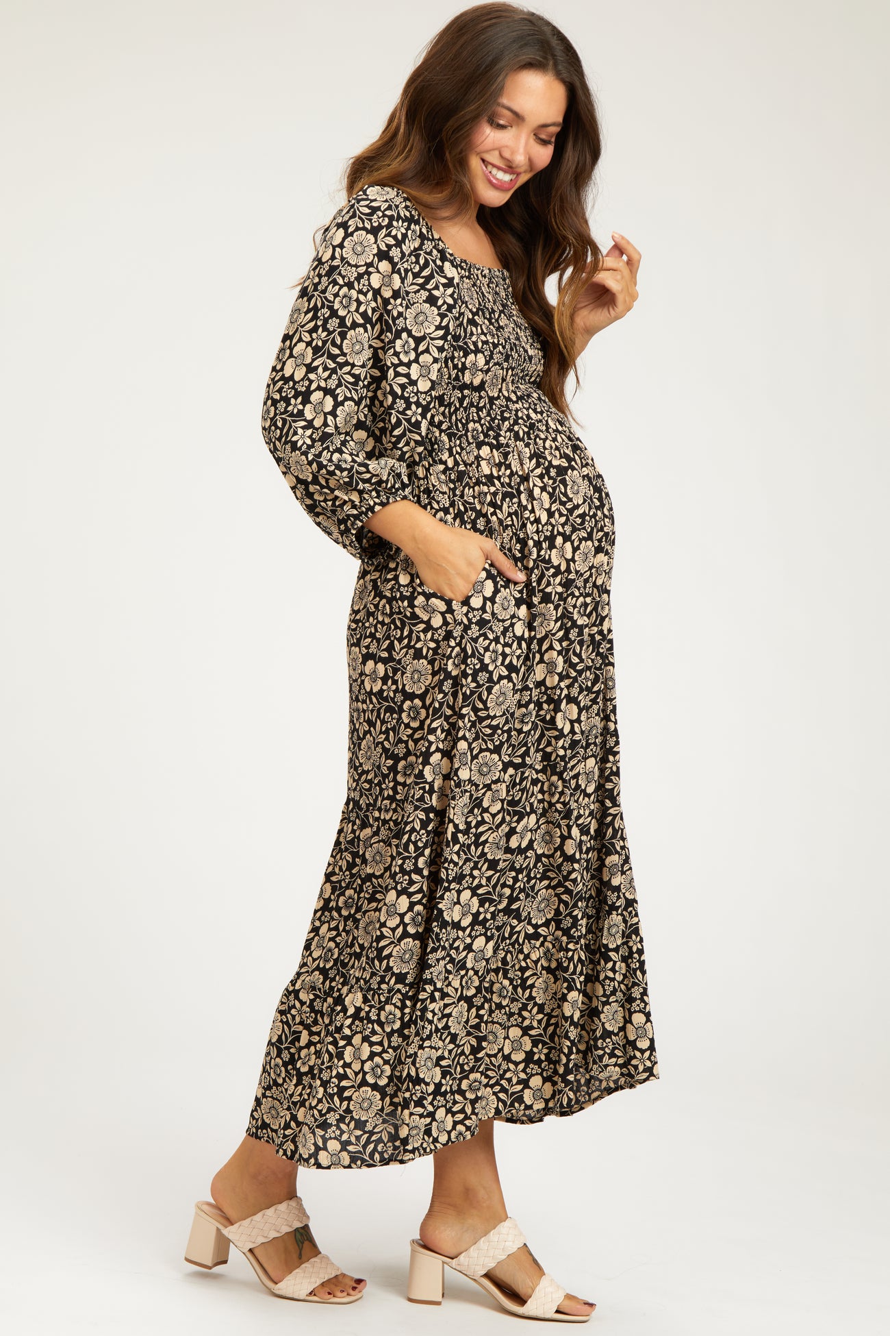 A floral maternity midi dress with a squared neckline, half-length puff sleeves, a smocked top, side pockets, and a tiered skirt.