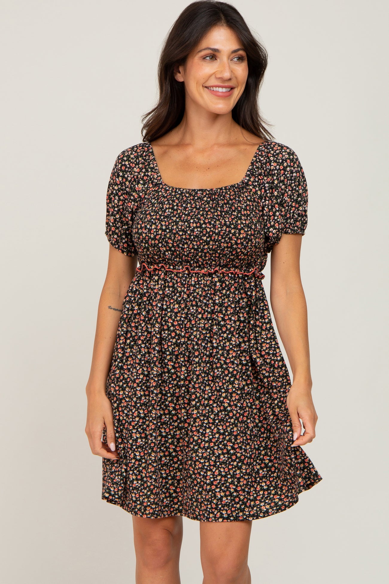 Details A floral dress with short puff sleeves, a smocked top, and a ruffled waistline. Content + Care