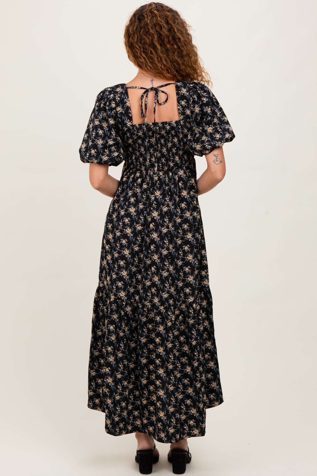 Black Floral Smocked Square Neck Short Puff Sleeve Midi Dress