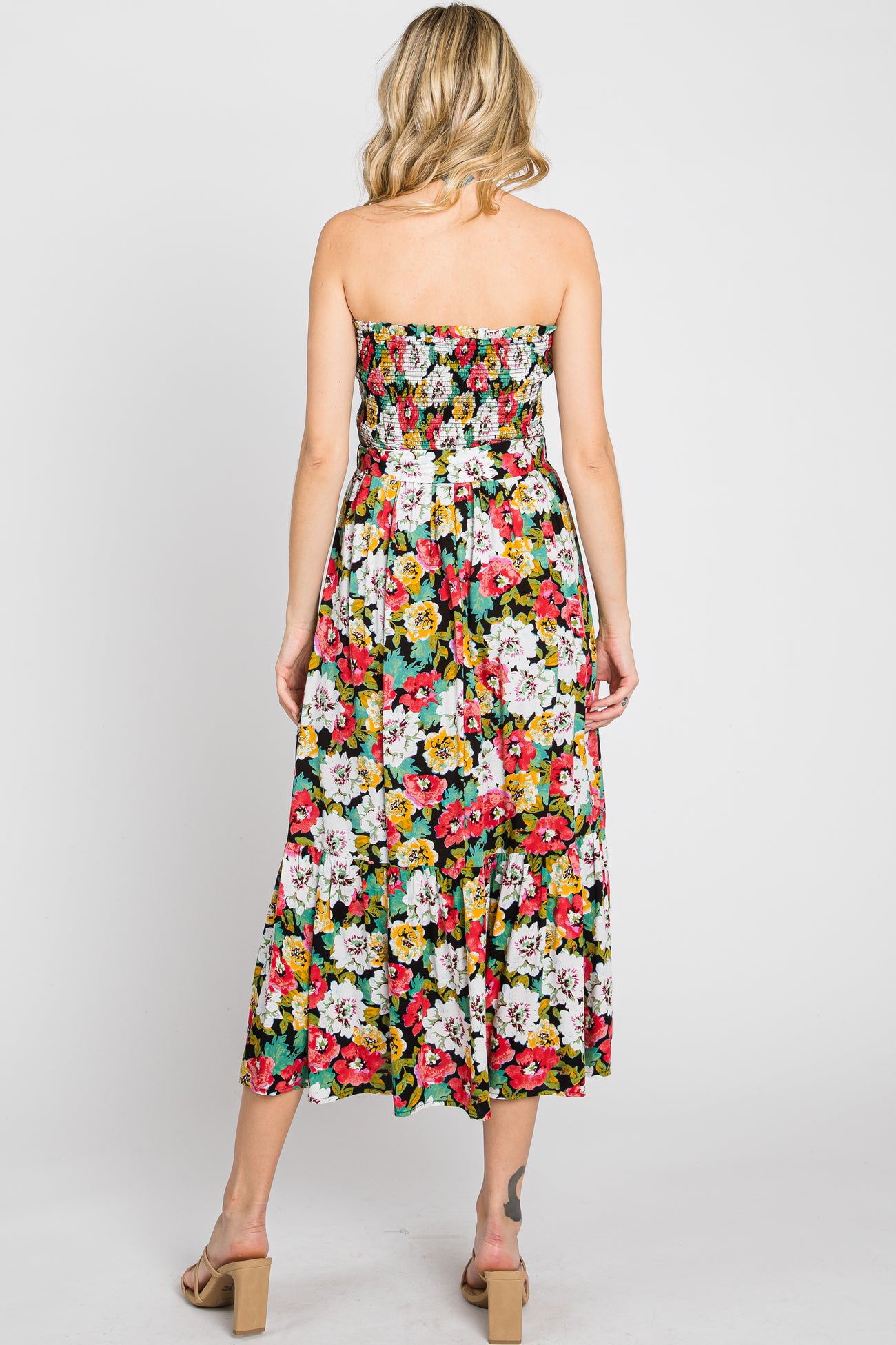 A strapless, floral midi dress with a smocked top, a waist tie, and a gathered bottom hem. Skirt is lined.