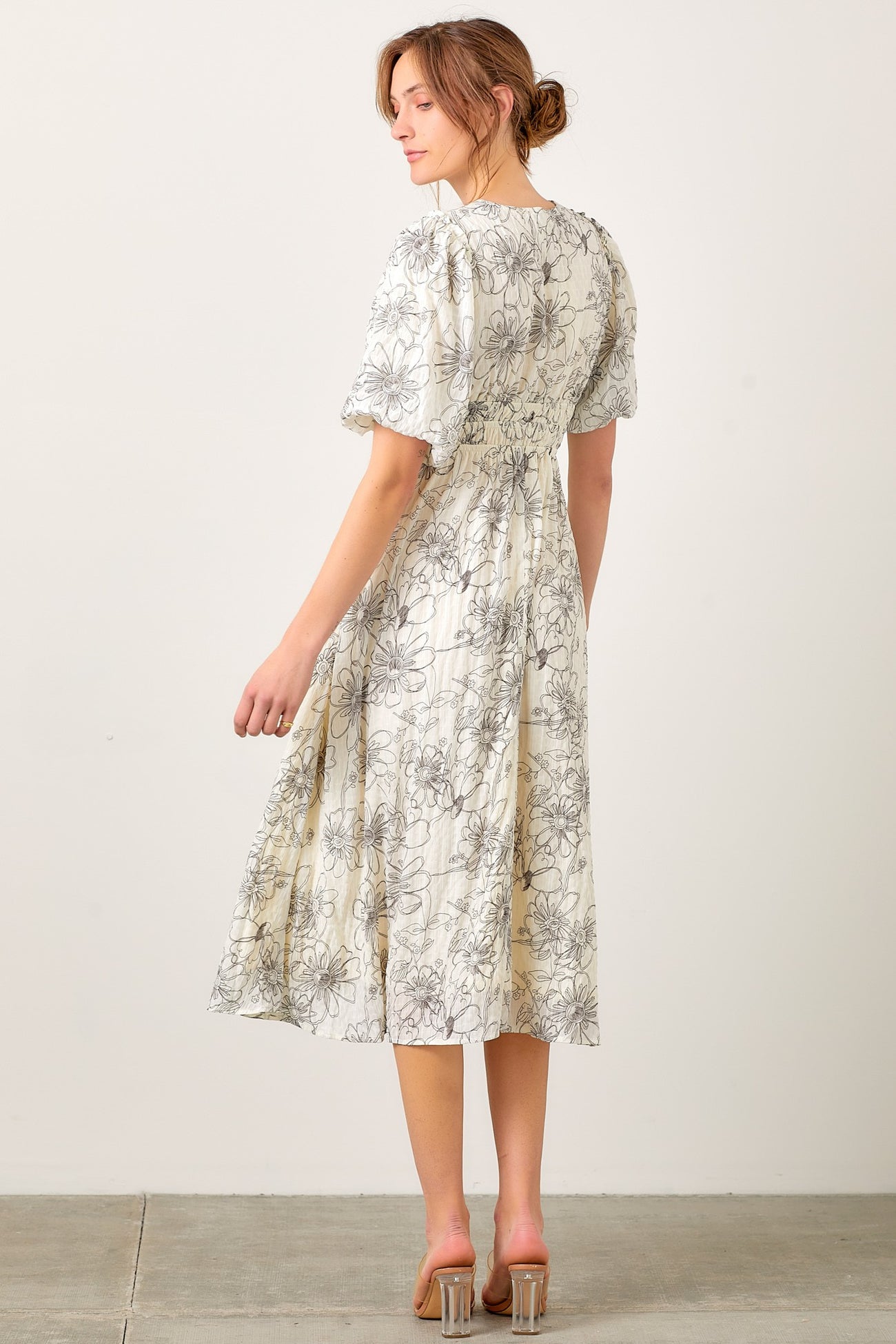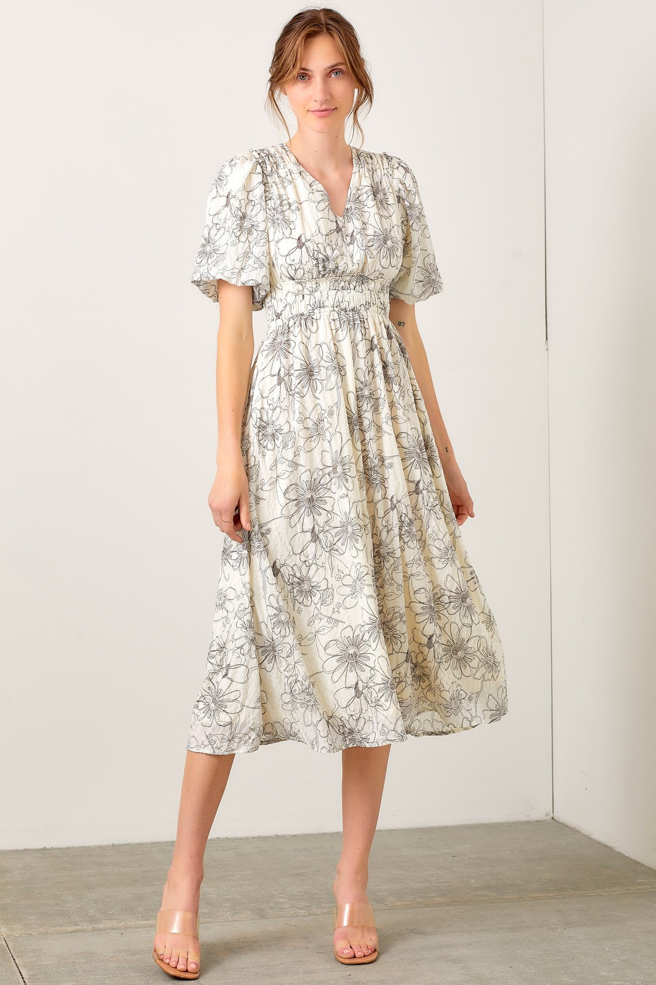 Black Floral Smocked Waist Midi Dress