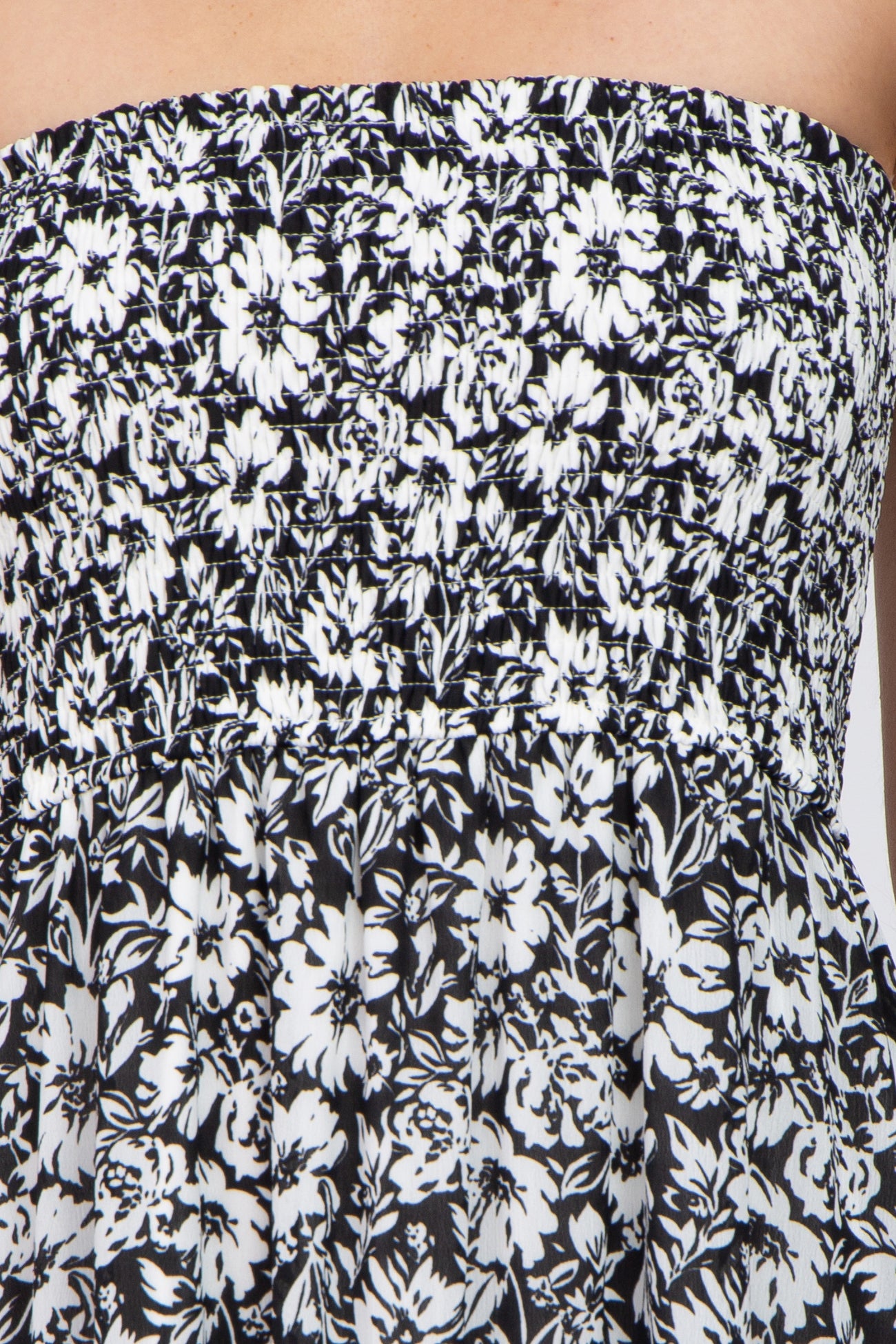 Details A floral print strapless maxi dress with a smocked bodice and ruffle hem. Dress is double lined. Content + Care