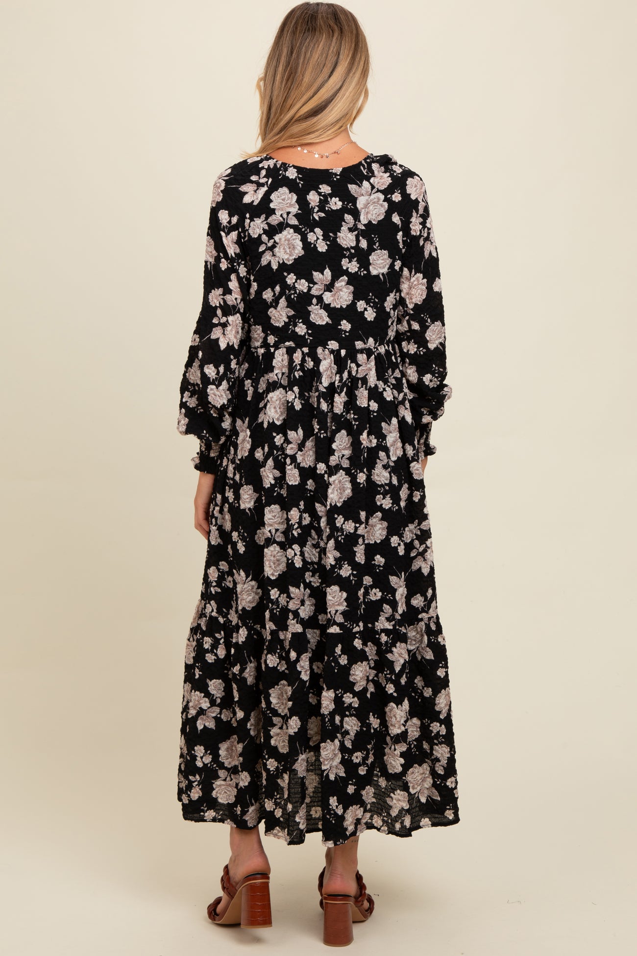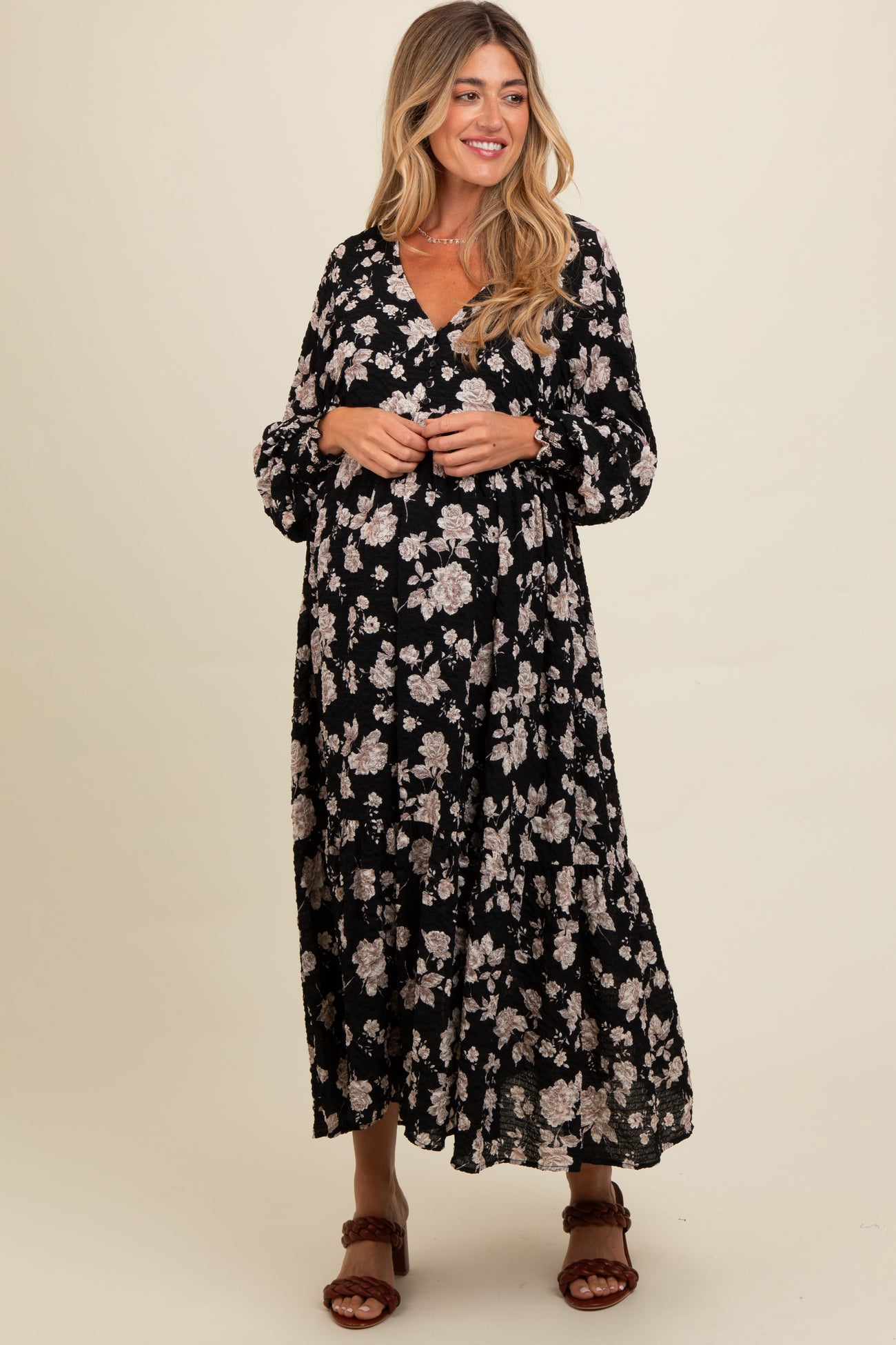 Black Floral Textured Bubble Sleeve Maternity Maxi Dress