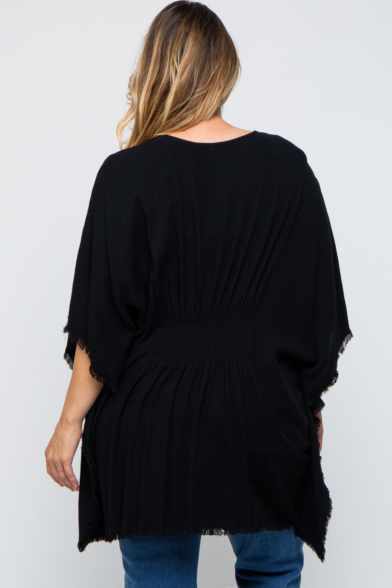 Details A solid short sleeve maternity plus cover up with an open front, smocking in back and fringe detail. Content + Care