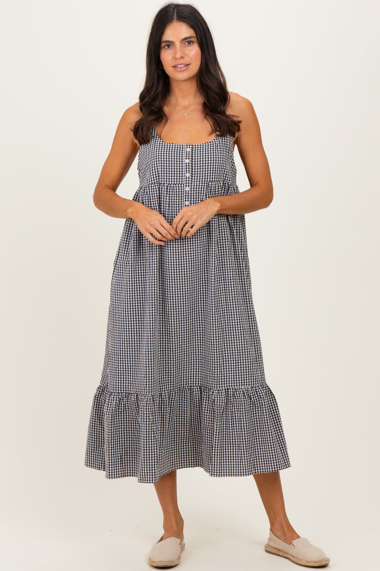 Effortlessly chic and perfect for warm days, this sleeveless midi dress features a classic gingham pattern that adds timeless appeal. Designed with a flattering empire waist and delicate button-front detailing, it offers a comfortable, flowy fit that moves gracefully with you. The ruffled hem adds a playful touch, while the lightweight fabric ensures breathability and ease. Pair it with sandals for a casual daytime look or dress it up with heels and accessories for a stylish evening out. This versatile dress is a must-have staple for your seasonal wardrobe!