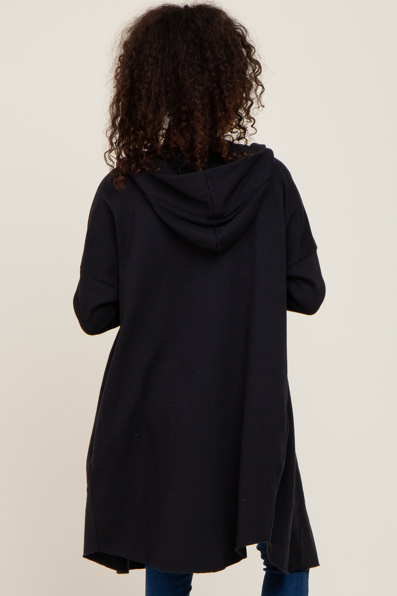 A solid long cardigan with an open front and hood in a fleece sweatshirt material.
