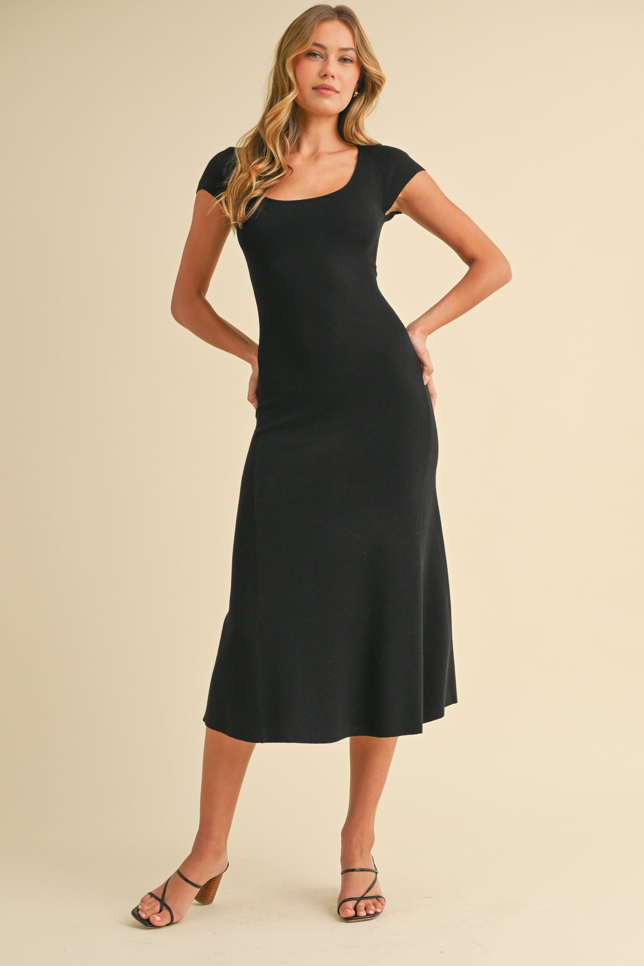 Black/Ivory Short Cap Sleeve Tie Back Sweater Midi Dress