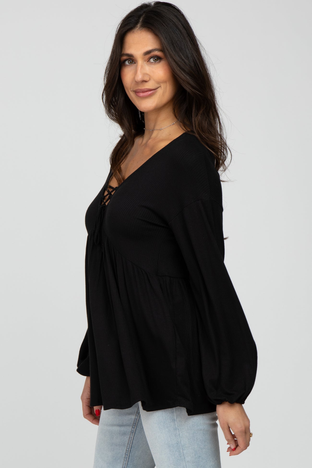 Black Lace-Up Front Long Sleeve Babydoll Top