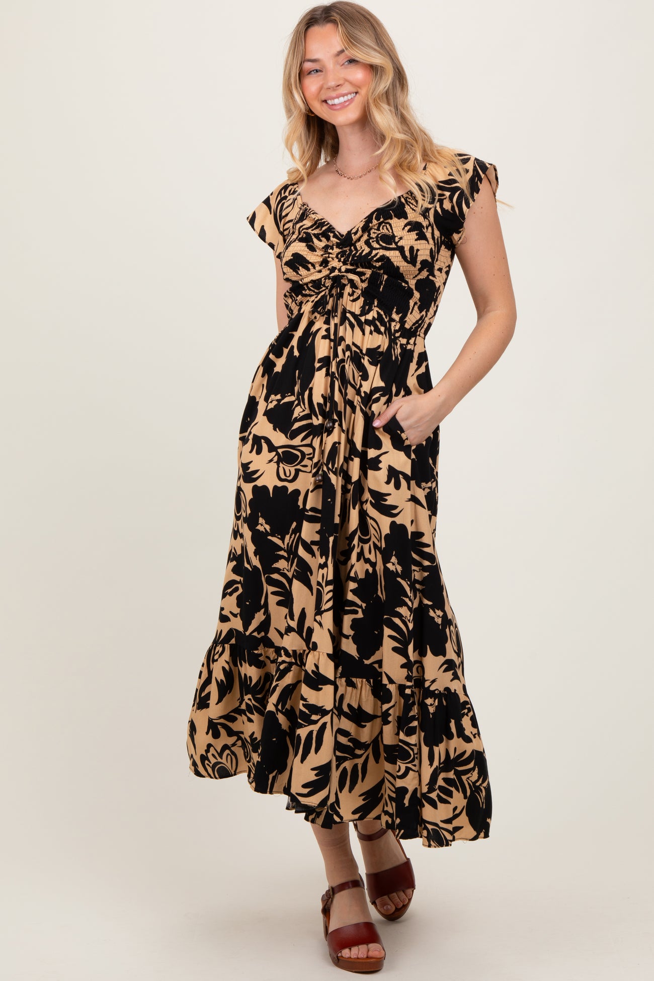 Elevate your maternity wardrobe with our Black Mocha Smocked Top Maternity Midi Dress. Featuring a flattering smocked bodice that offers gentle stretch and support for your growing bump, this dress combines comfort with style. The chic black and mocha abstract print adds a sophisticated touch, while the flutter sleeves and V-neckline enhance its feminine charm. Crafted from lightweight, breathable fabric, it flows effortlessly to a midi length, perfect for any occasion from casual days to special events. Pair with sandals or flats for an easy, elegant look throughout your pregnancy journey.