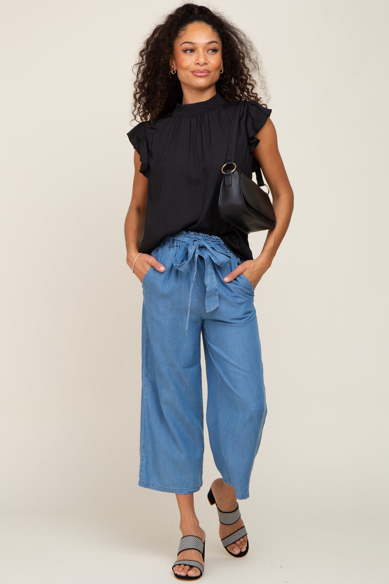 A solid blouse featuring a smocked mock neck, flutter sleeves and a back keyhole cutout with a button closure.