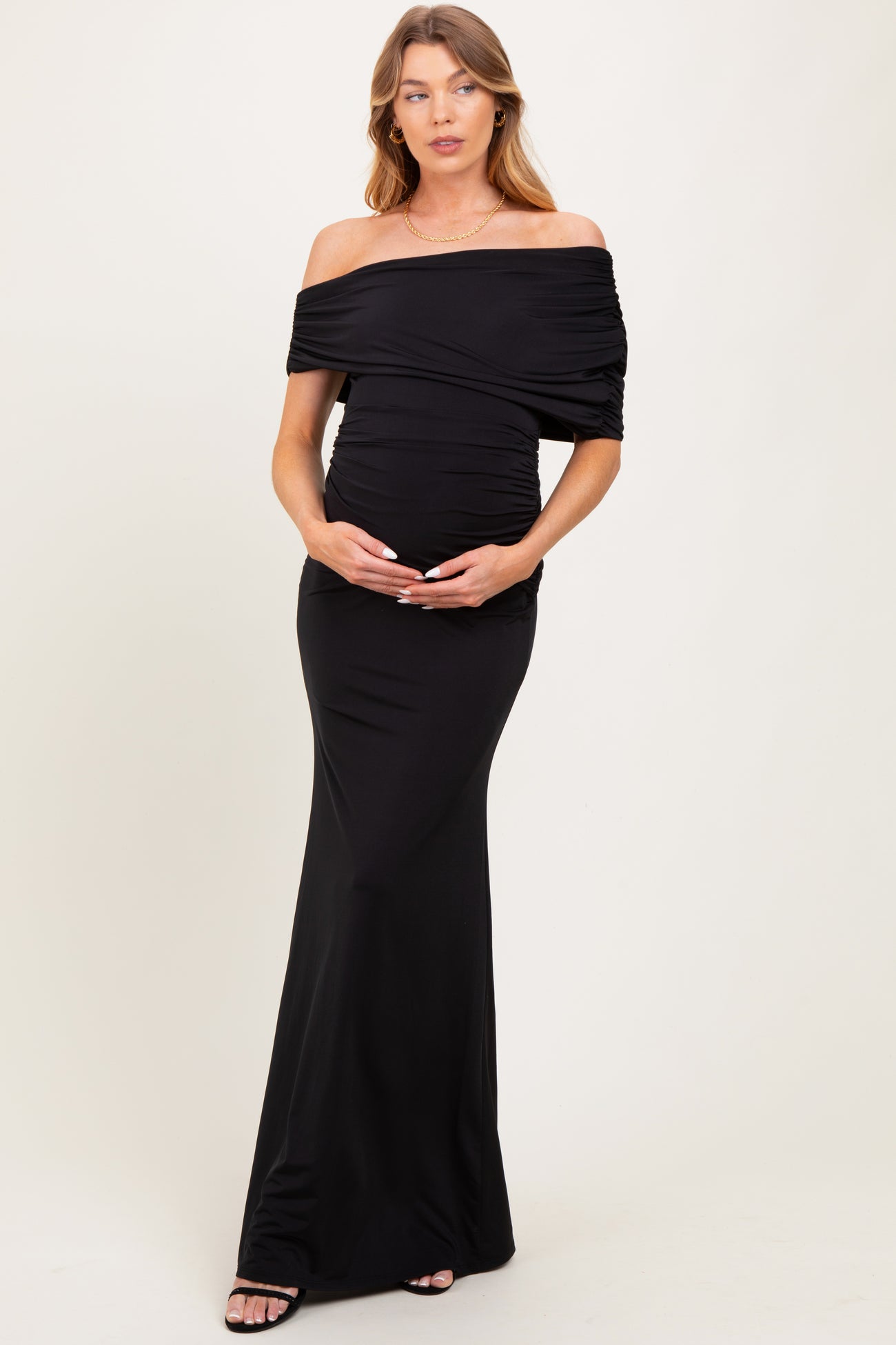 Black Off Shoulder Foldover Ruched Maternity Maxi Dress