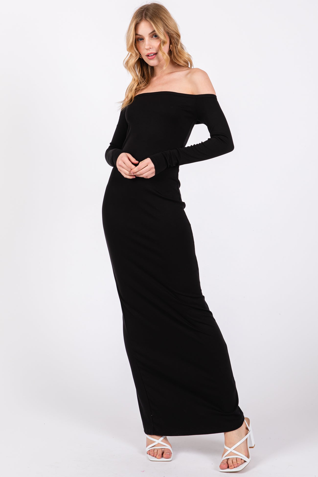 Details A solid long sleeve off shoulder fitted maxi dress with slit at back bottom hem. Content + Care
