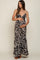 A palm printed maternity maxi dress featuring a v-neckline, a front knot twist, a front cutout, adjustable cami straps, a smocked elastic back and a ruffle hem.