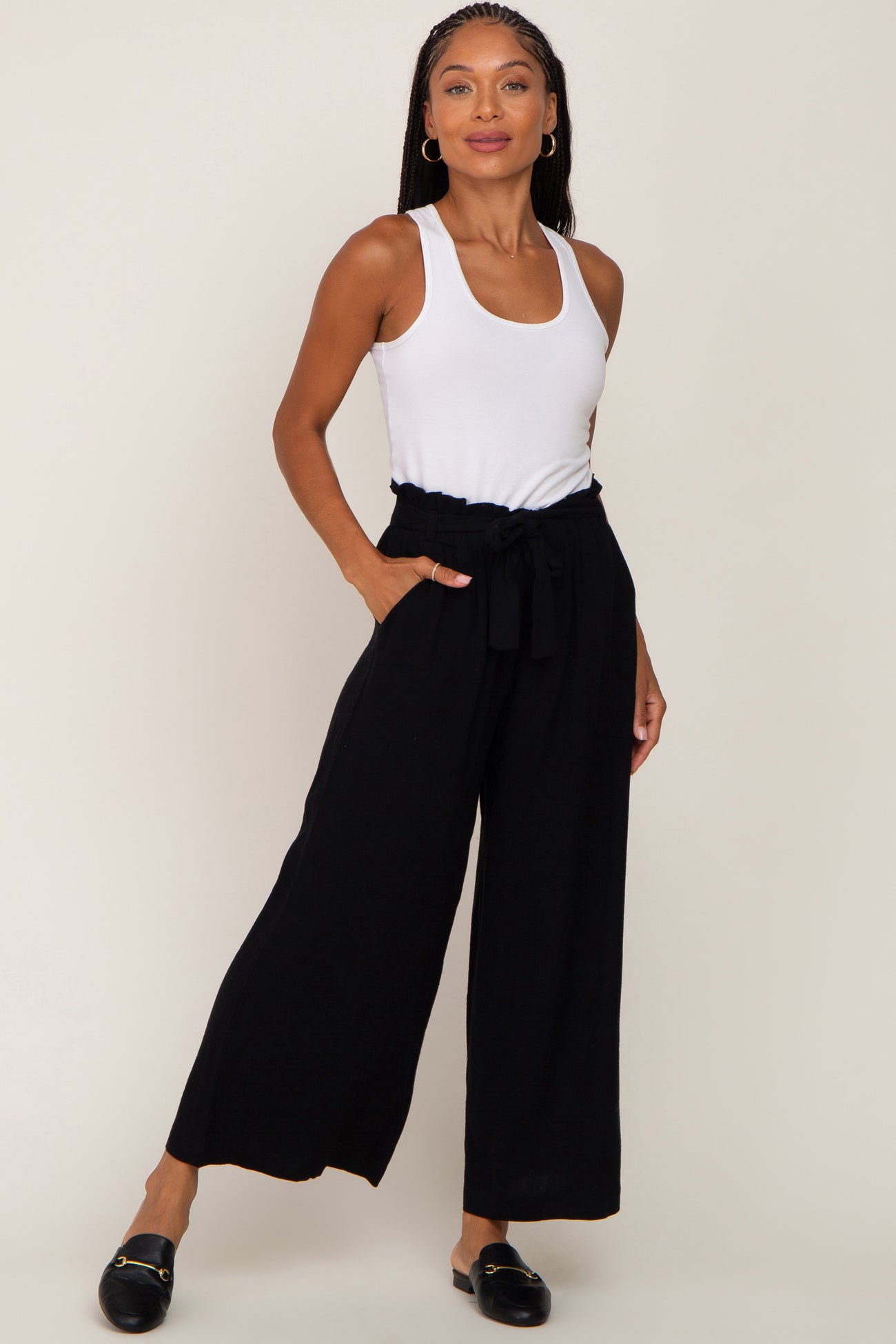 A solid pair of pants in a wide leg style with a pull on elastic waistline with ruffle and tie detail. Pocketed.