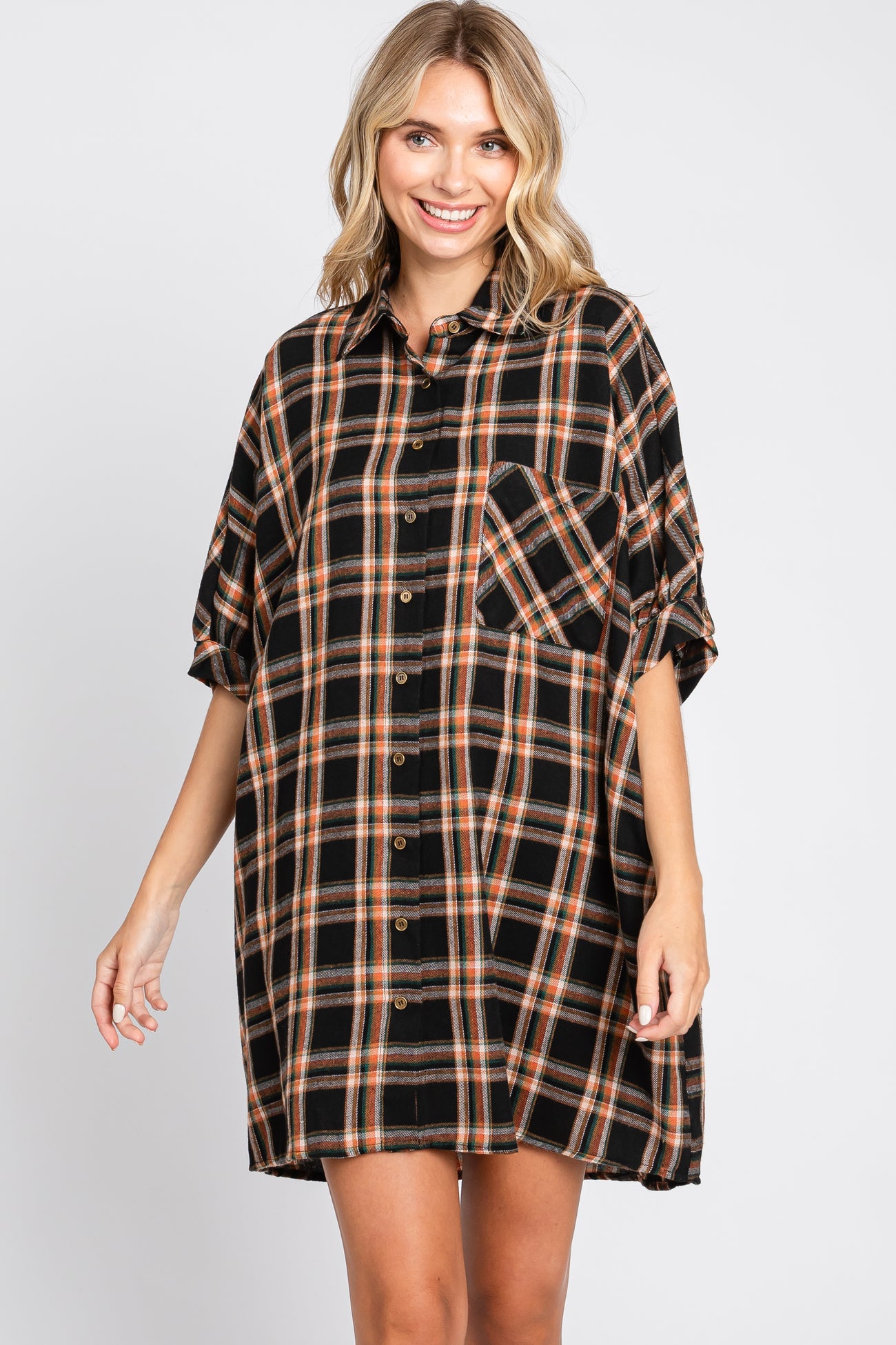 Details A plaid oversized flannel mini dress with a collared neckline, button down front closure, hi-low hem and front check pocket detail. Content + Care