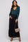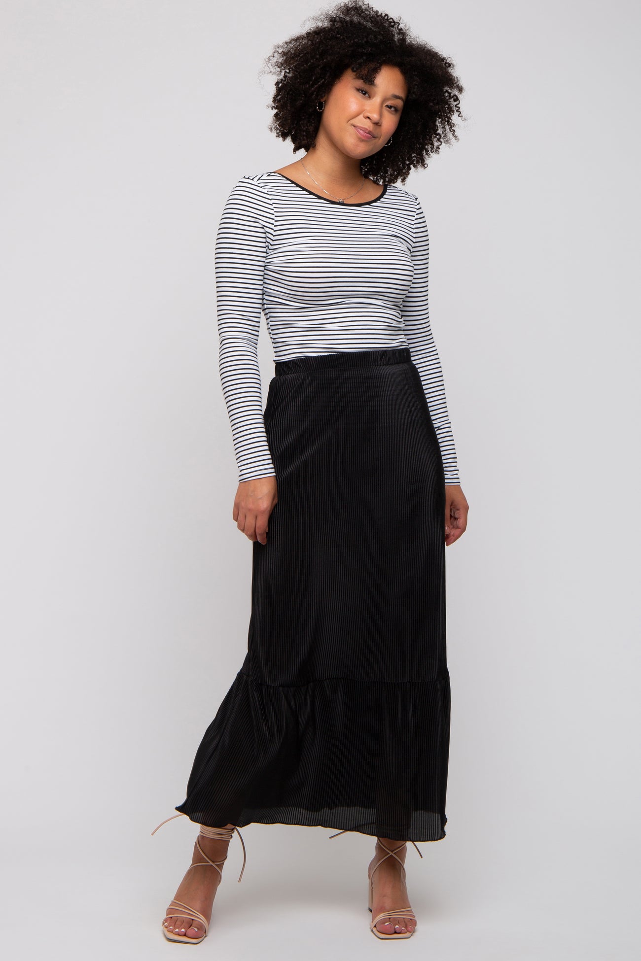 A solid pleated maternity maxi skirt with an elastic waistband and ruffle hem.