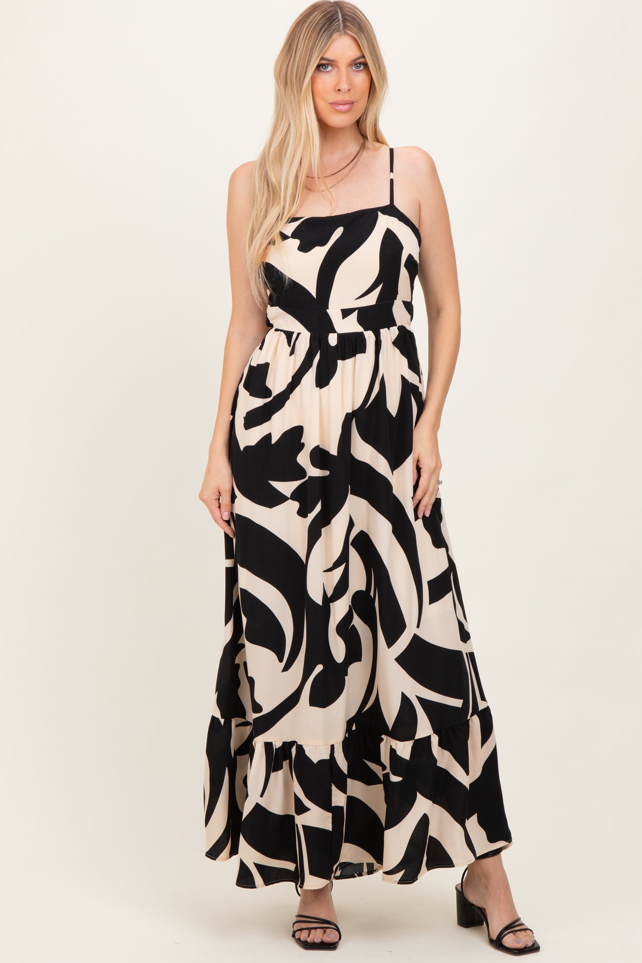 Stay stylish and comfortable throughout your pregnancy with our Black Printed Sleeveless Cutout Tie Back Maternity Maxi Dress. Featuring a chic black and cream abstract print, this dress offers a flattering square neckline and adjustable spaghetti straps for a perfect fit. The cutout detail on the sides combined with a tie-back closure adds a trendy touch while allowing room for your growing bump. Made from lightweight, breathable fabric, it flows effortlessly to the ankle, making it ideal for casual outings, baby showers, or special events. Elevate your maternity wardrobe with this versatile maxi dress designed for both comfort and style.