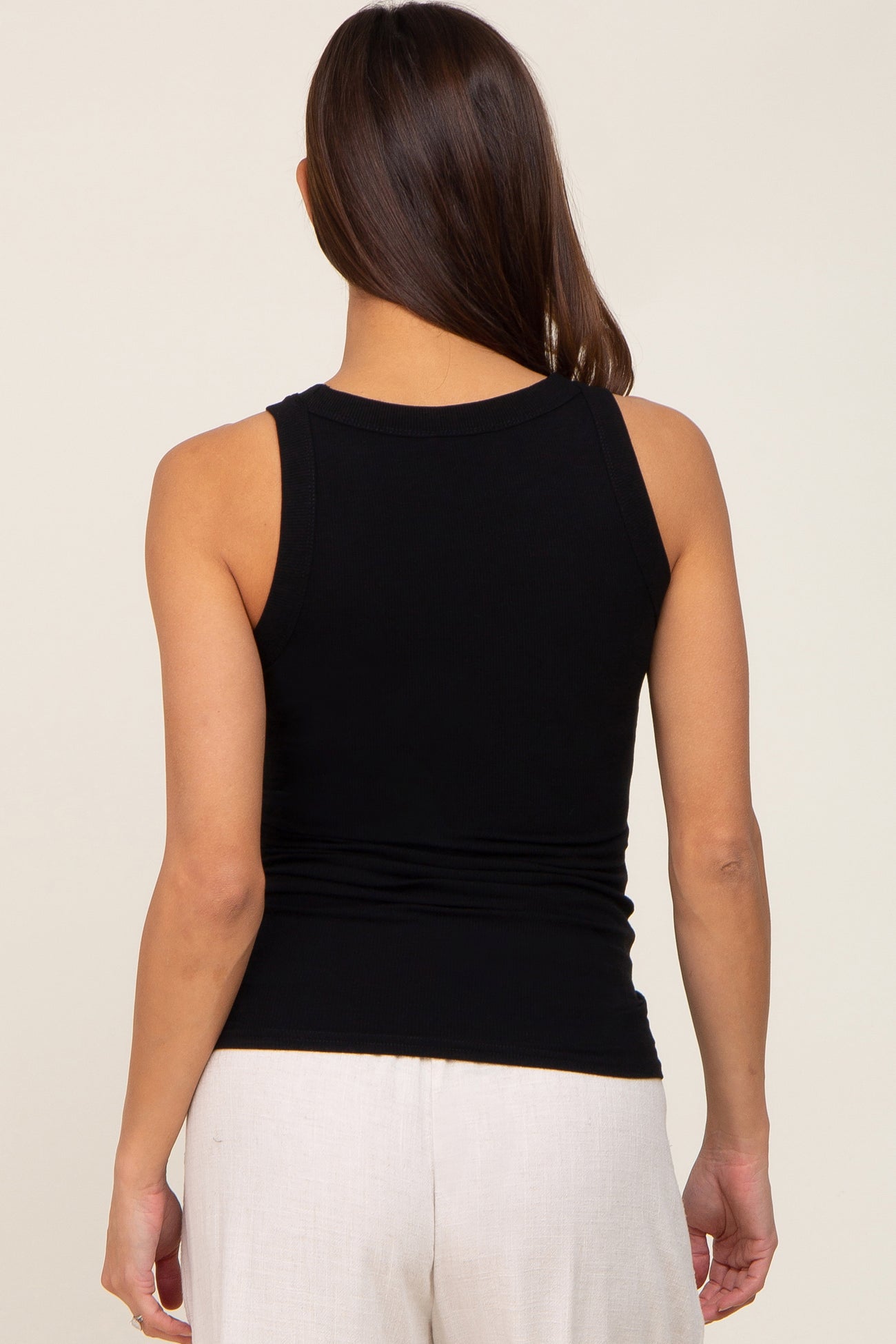 A solid maternity tank top with a higher neckline and ribbed material.