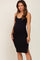 A ribbed maternity midi dress featuring adjustable straps, a scoop neckline, a button front top, and side slits.