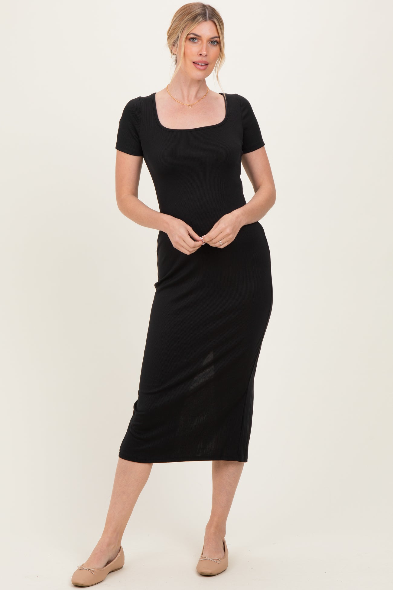 Effortlessly chic and designed to flatter your growing bump, this ribbed fitted maternity midi dress is a must-have staple. Crafted from a soft, stretchy fabric, it provides comfortable support throughout pregnancy without compromising style. The short sleeves and scoop neckline offer a flattering silhouette, while the midi length adds a touch of elegance to your everyday look. Perfect for casual outings or dressed up with accessories for special occasions, this versatile dress ensures you feel confident and comfortable all day long. Easy to pair with sneakers or heels for a trendy maternity outfit.