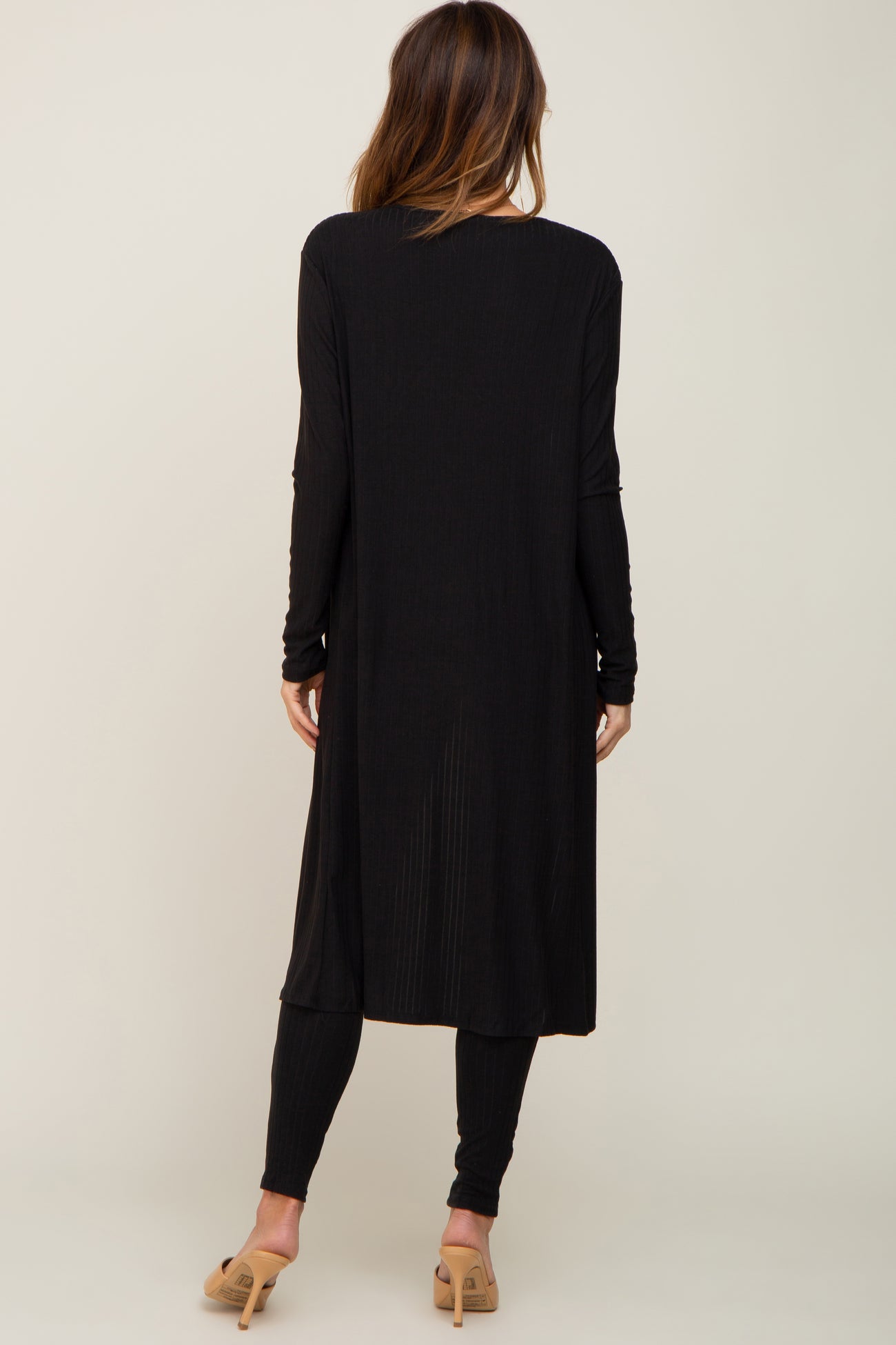 A ribbed knit jumpsuit set featuring a sleeveless fitted bodycon jumpsuit and a long sleeve cardigan.