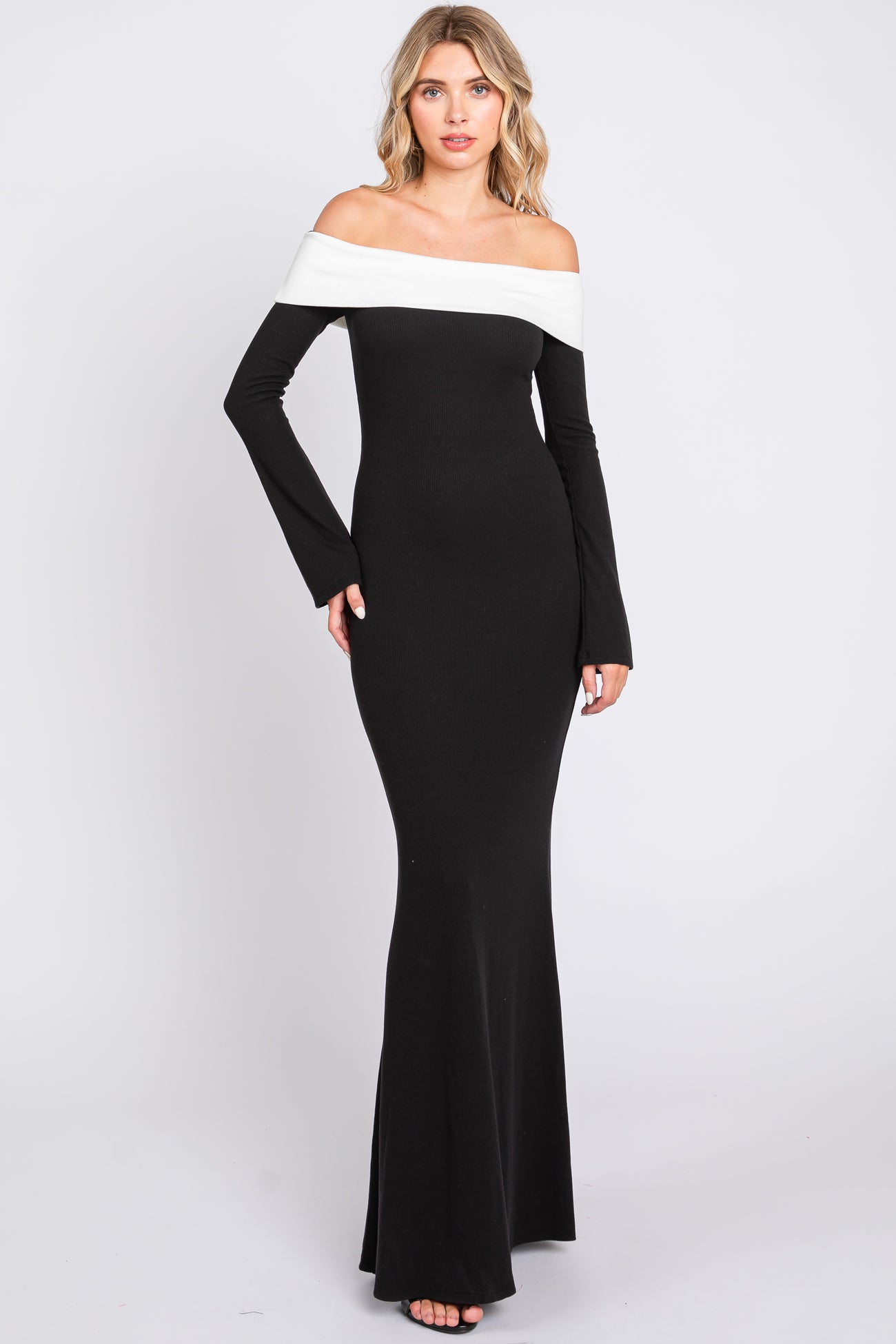 Black Ribbed Knit Colorblock Long Sleeve Off Shoulder Gown