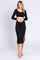 A solid ribbed set. Crop top features long sleeves and a rounded neckline. Midi skirt features a side slit and elastic waist band.