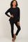 A solid ribbed pajama set featuring a top with long sleeves and a rounded neckline. Long pants.