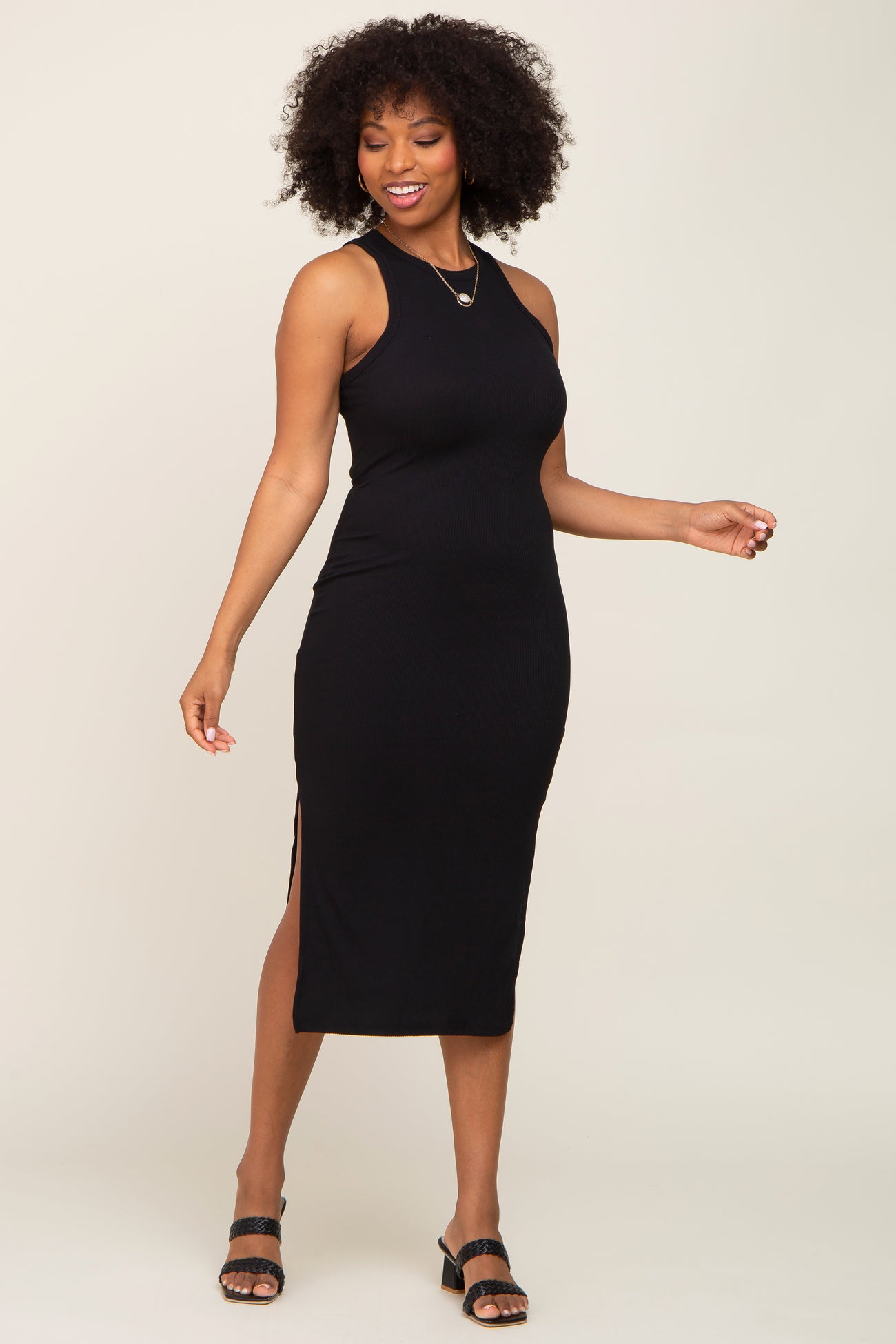 Black Ribbed Sleeveless Side Slit Maternity Midi Dress