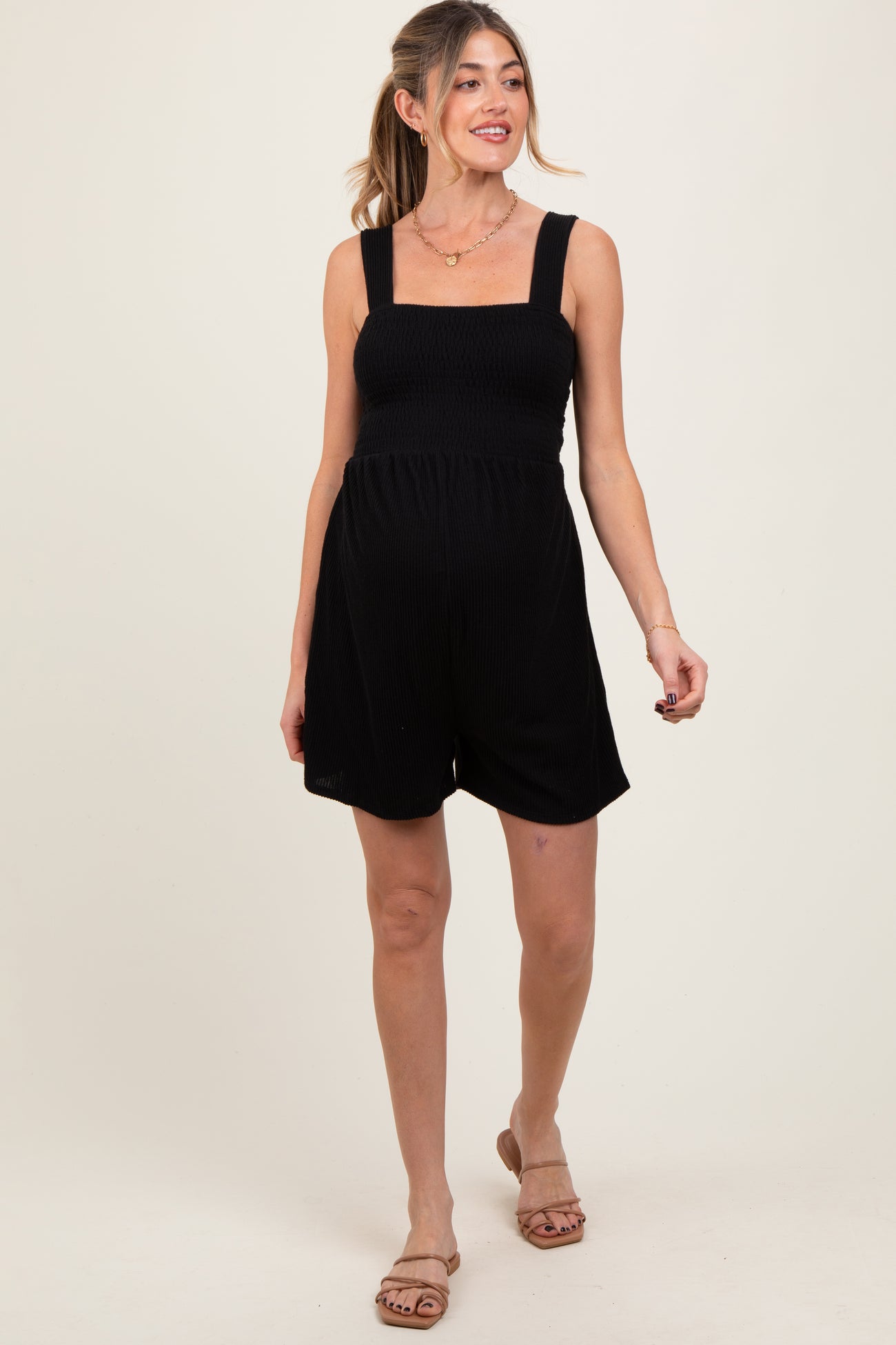 Stay stylish and comfortable with our Black Ribbed Smocked Bodice Maternity Romper. Designed with a stretchy smocked bodice and wide straps, this romper offers a flattering fit that adapts to your growing belly. The lightweight ribbed fabric ensures breathability and ease of movement, perfect for everyday wear or special occasions. Its chic black hue pairs effortlessly with your favorite accessories. Whether you're at home or out and about, this romper combines fashion and maternity comfort in one versatile piece. Perfect for moms-to-be who want confidence and style throughout pregnancy.