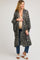 A printed maternity cover up featuring long wide sleeves with ruffle trim, a ruffle hem and metallic threading.