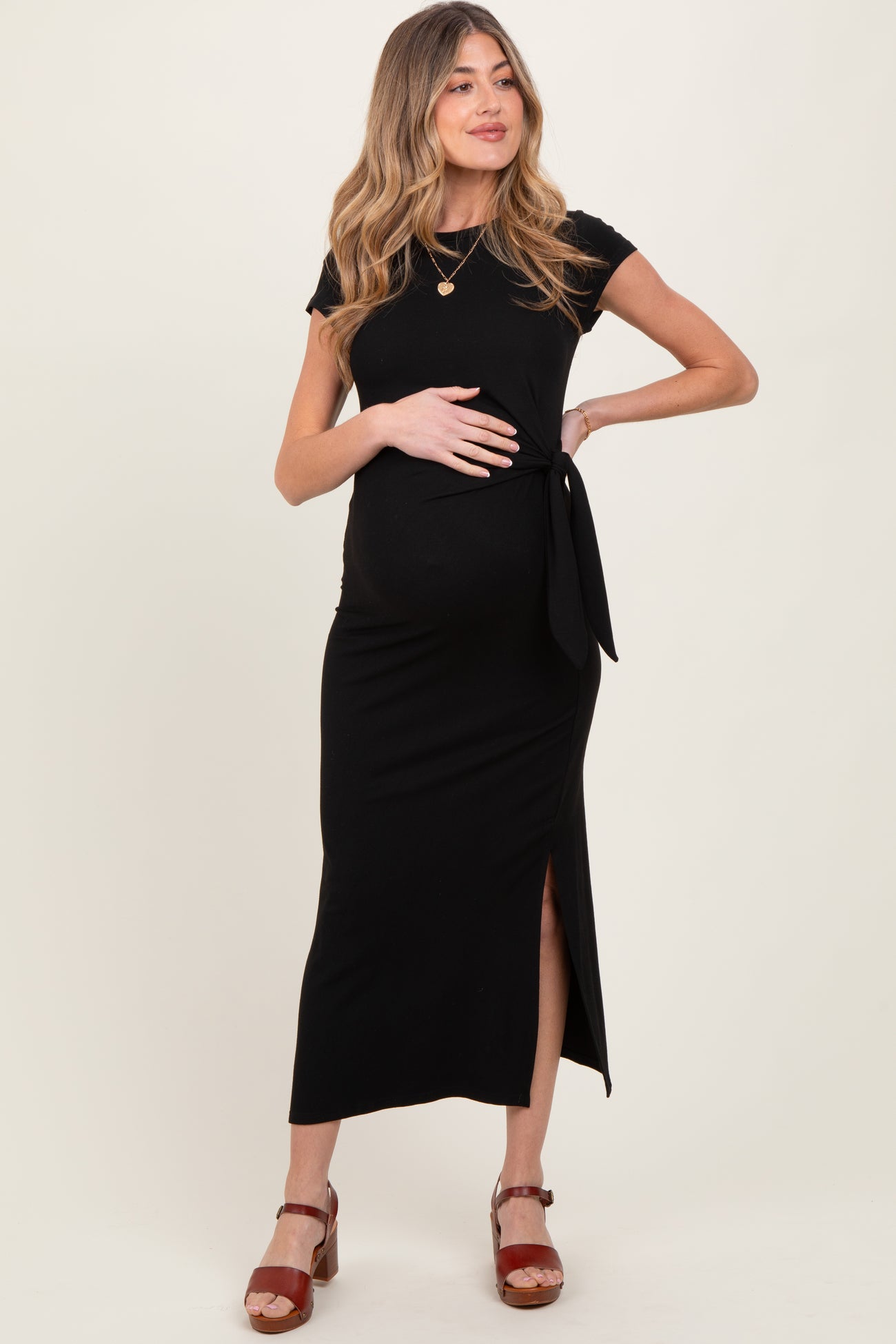 Black Side Knot Tie Short Sleeve Maternity Midi Dress