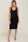 A solid sleeveless fitted maternity dress featuring side ruching and a rounded neckline.