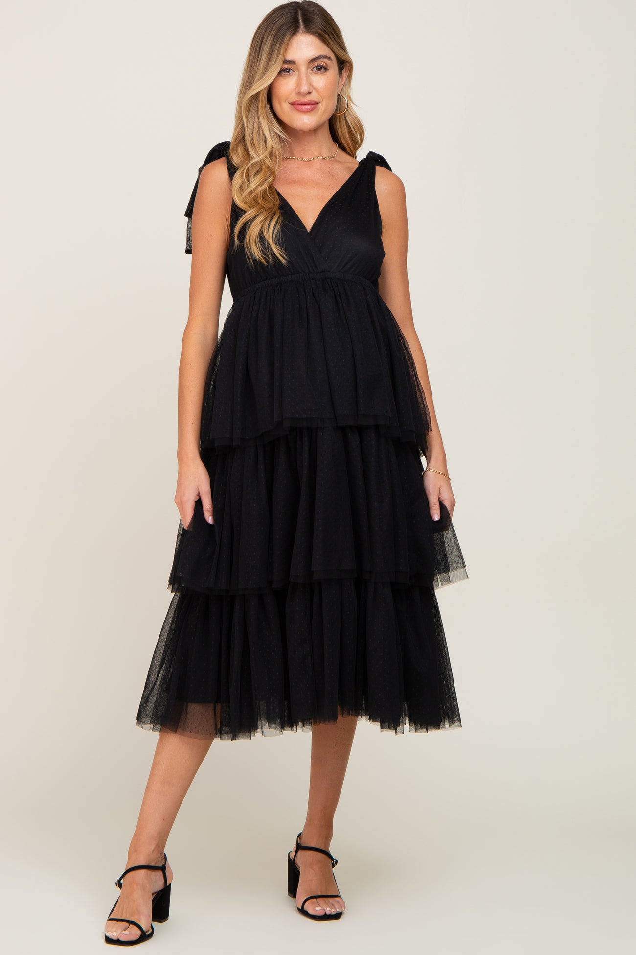Black Sleeveless Tiered Tie Strap Tulle Maternity Midi Dress