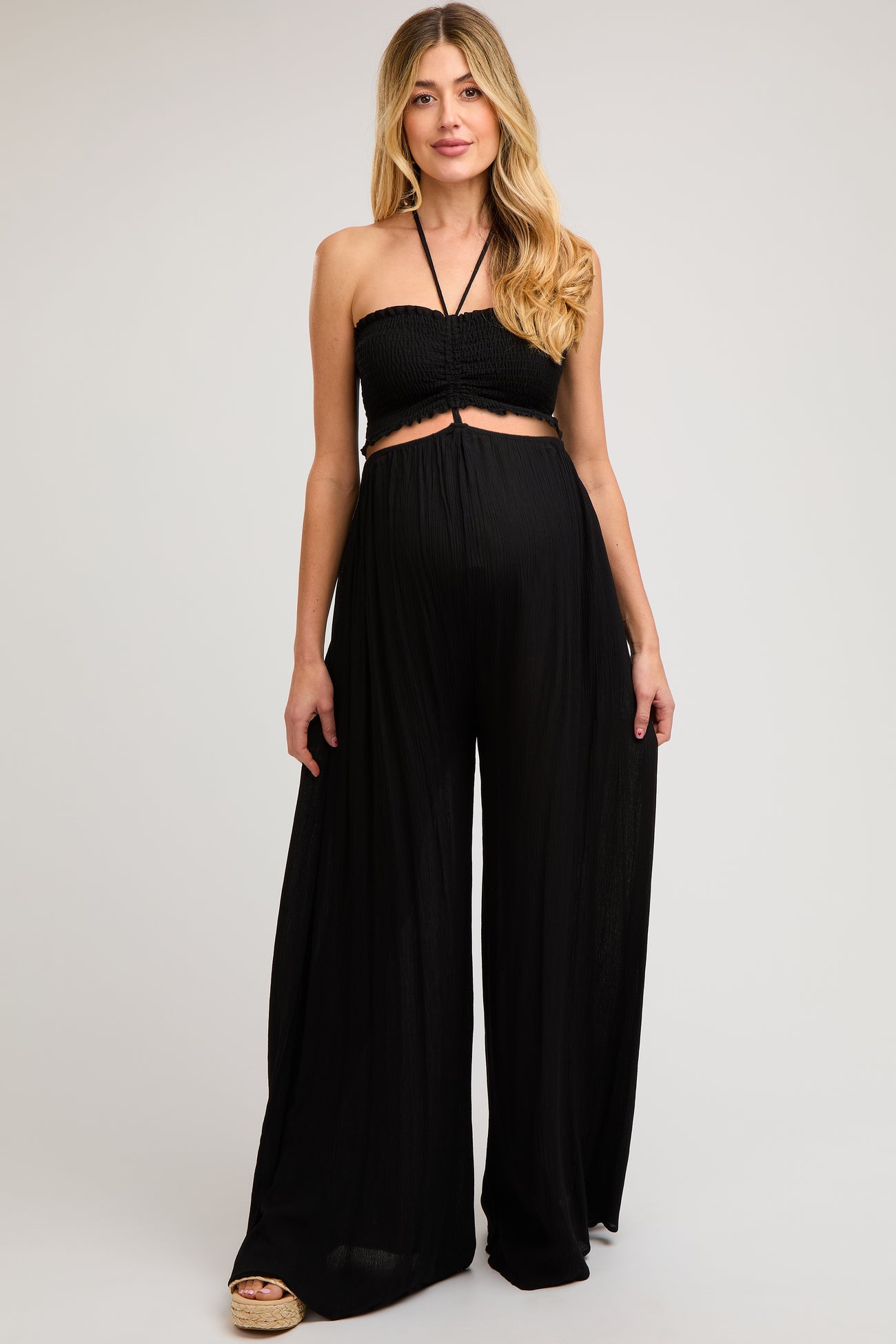 Black Smocked Drawstring Halter Side Cutout Maternity Jumpsuit