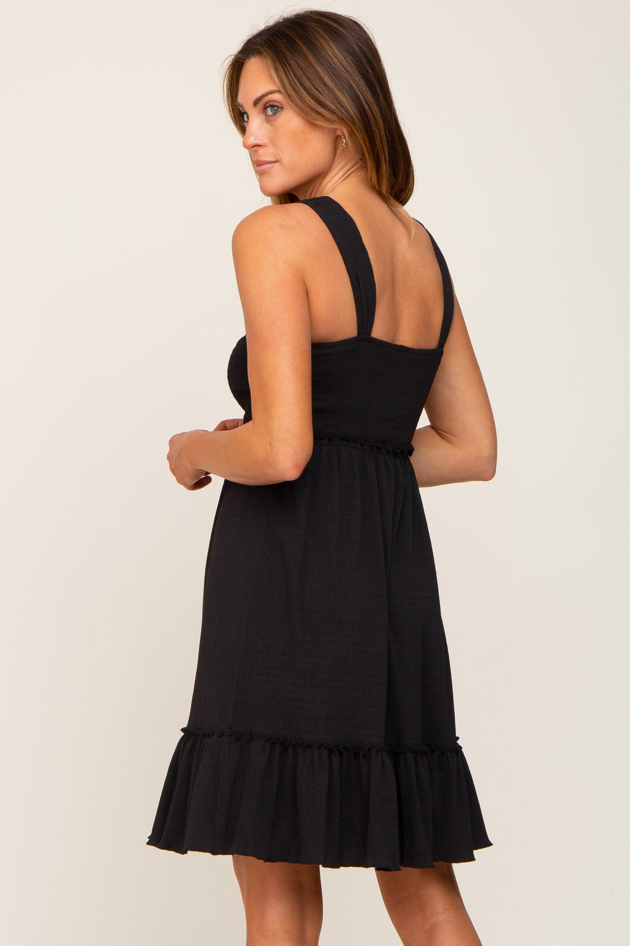 A sold crepe textured dress. Features a smocked top, and gathered detailing at the waist and bottom hem.