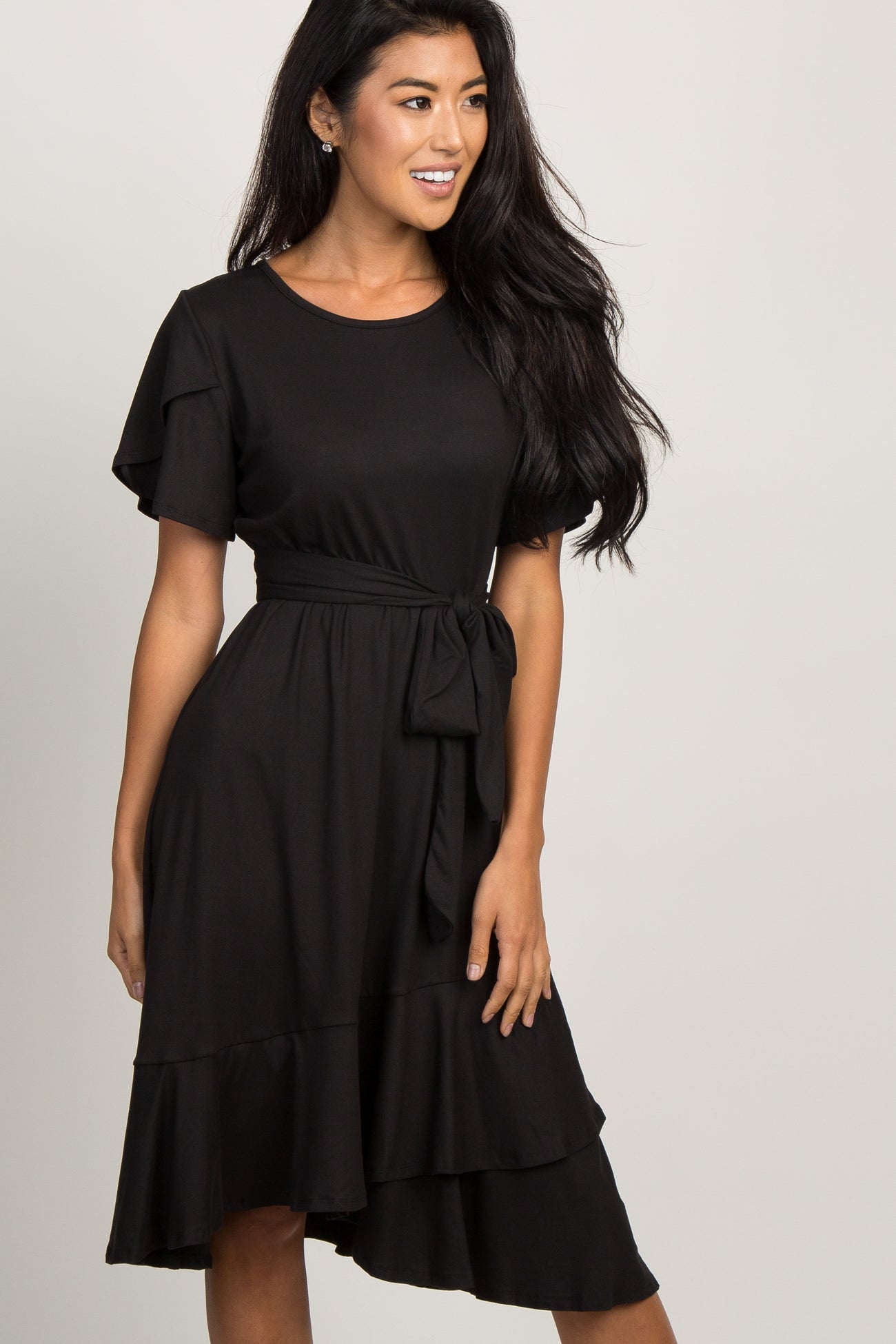 A solid hued maternity dress featuring rounded neckline, short sleeves, cinched elastic waistline with sash tie and wrap around flounce trim at the sleeves and hemline.