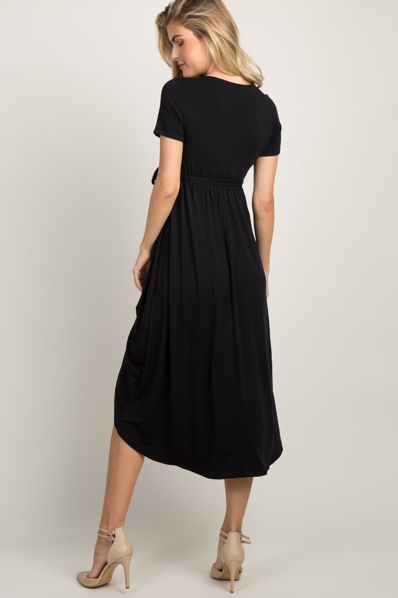 A solid hued wrap dress with a v-neckline, short sleeves, a hi-low hemline, and a sash tie.