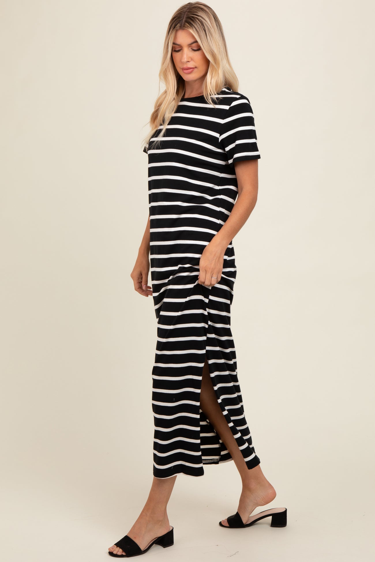Elevate your casual wardrobe with this Black Striped Side Slit Maxi Dress. Featuring classic horizontal white stripes on a sleek black backdrop, this dress offers timeless style and effortless elegance. The soft, breathable fabric ensures all-day comfort, while the side slit adds a hint of allure and freedom of movement. With short sleeves and a relaxed fit, it’s perfect for day-to-night wear. Pair it with sandals for a laid-back look or dress it up with heels and accessories for a chic evening vibe. Your go-to maxi for style, comfort, and versatility!
