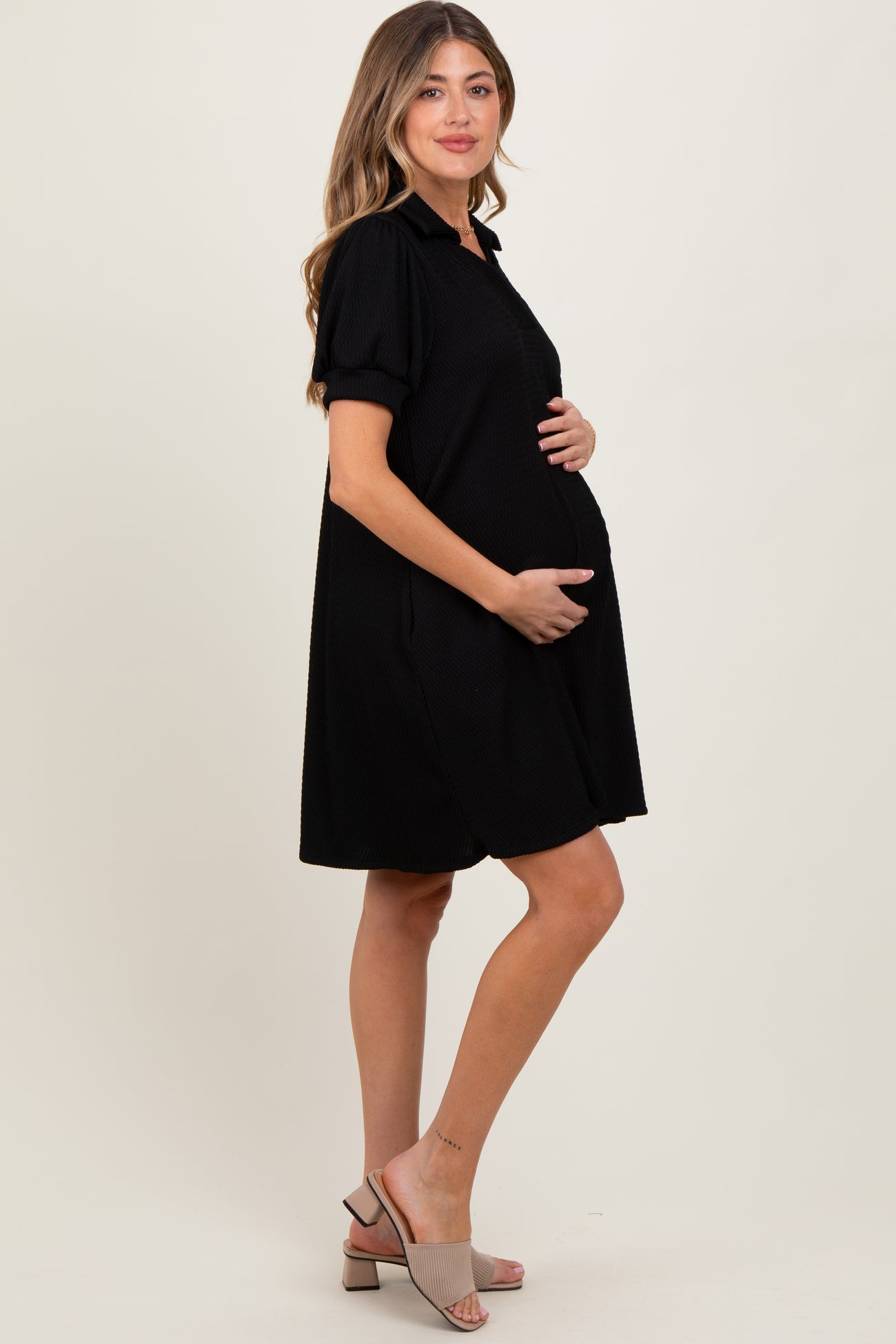 Black Textured Maternity Polo Dress