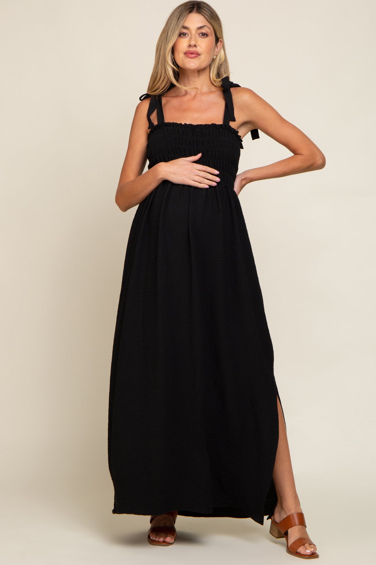 Black Textured Smocked Shoulder Tie Maternity Maxi Dress