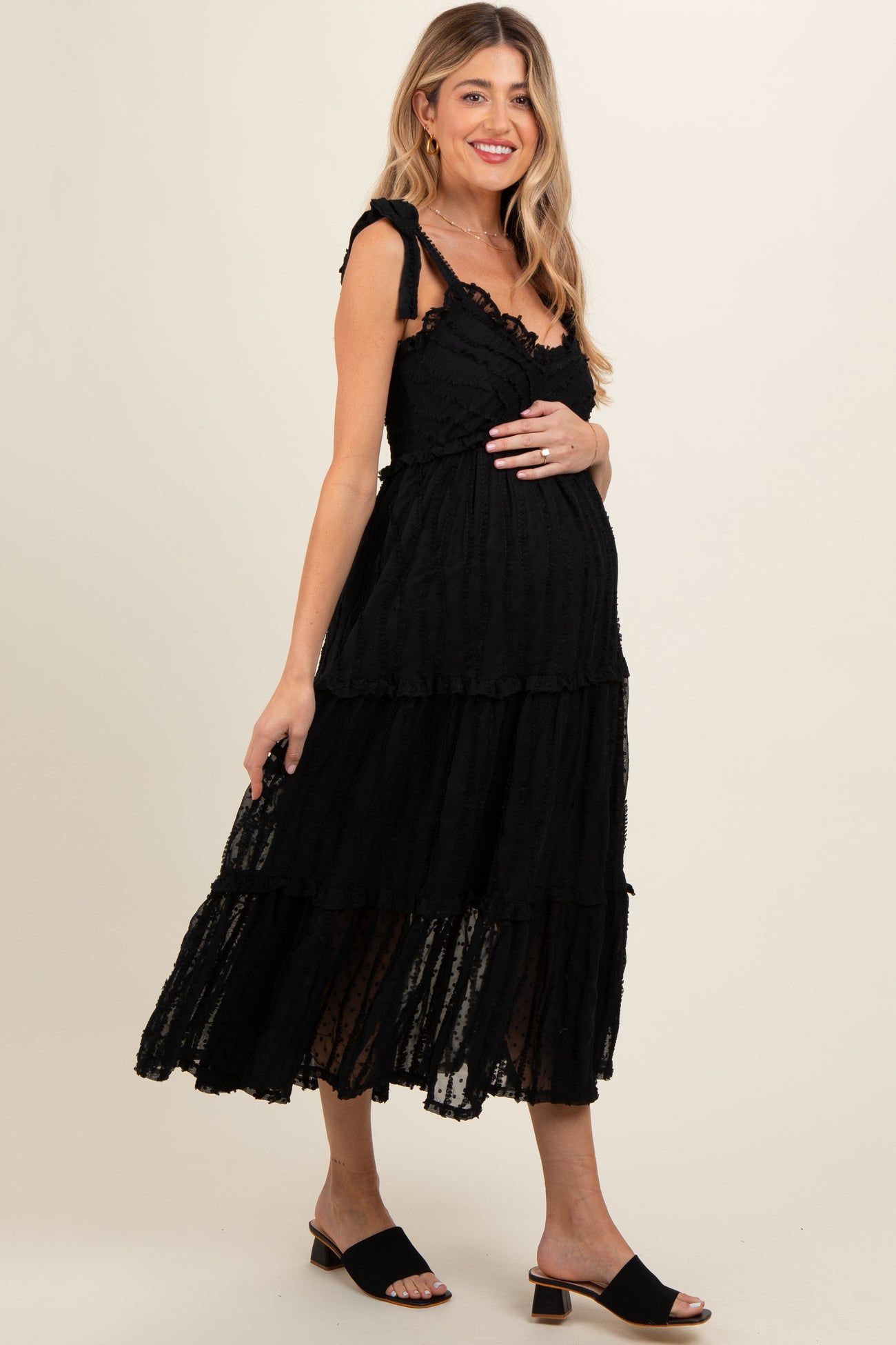 Black Textured Tie Strap Tiered Maternity Midi Dress