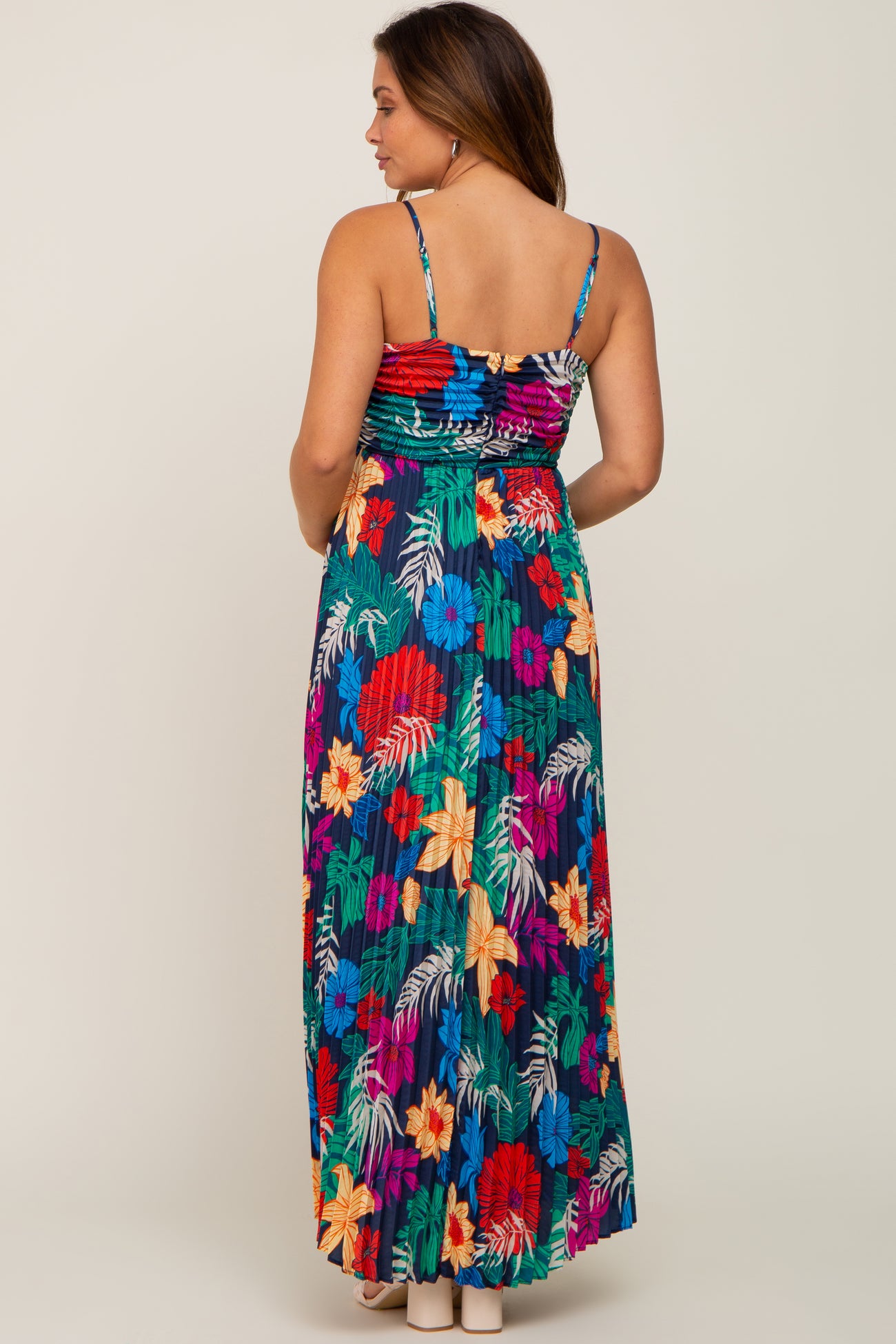 A tropical floral printed, satin pleated dress featuring a v-neckline, a ruched bust with an adjustable drawstring, adjustable cami straps and a back zipper.